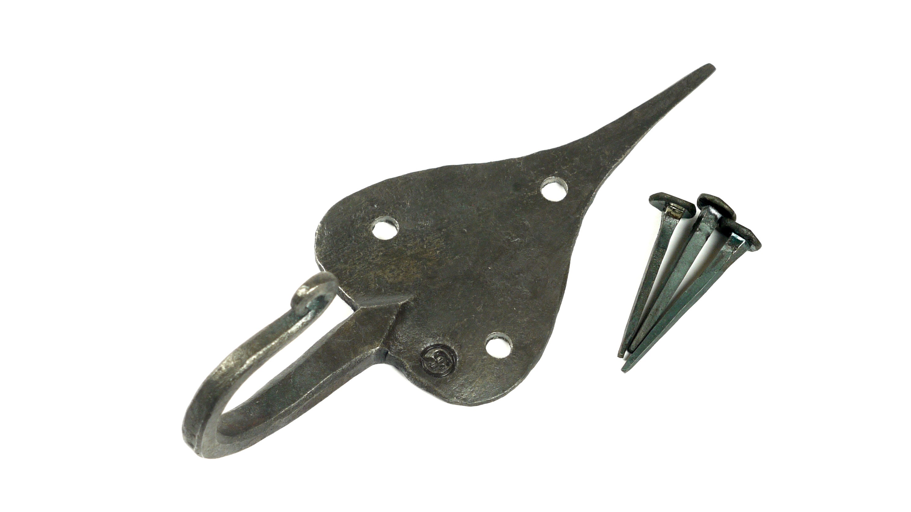 Geschmiedeter Haken, handgeschmiedet nach historischem Vorbild. Zur Verwendung als Kleiderhaken, Garderobenhaken zum aufhängen von Werkzeug oder ähnlichem.