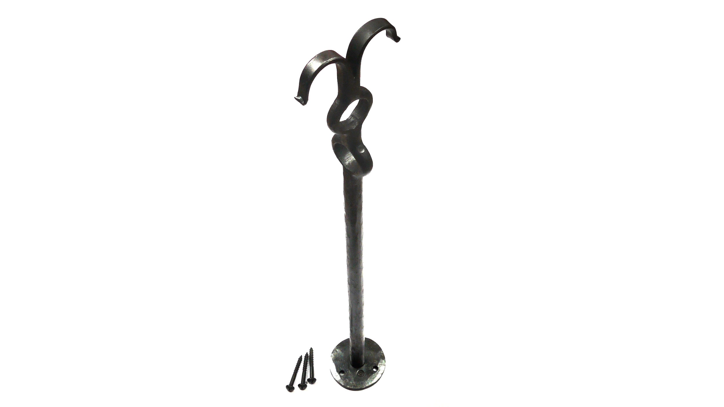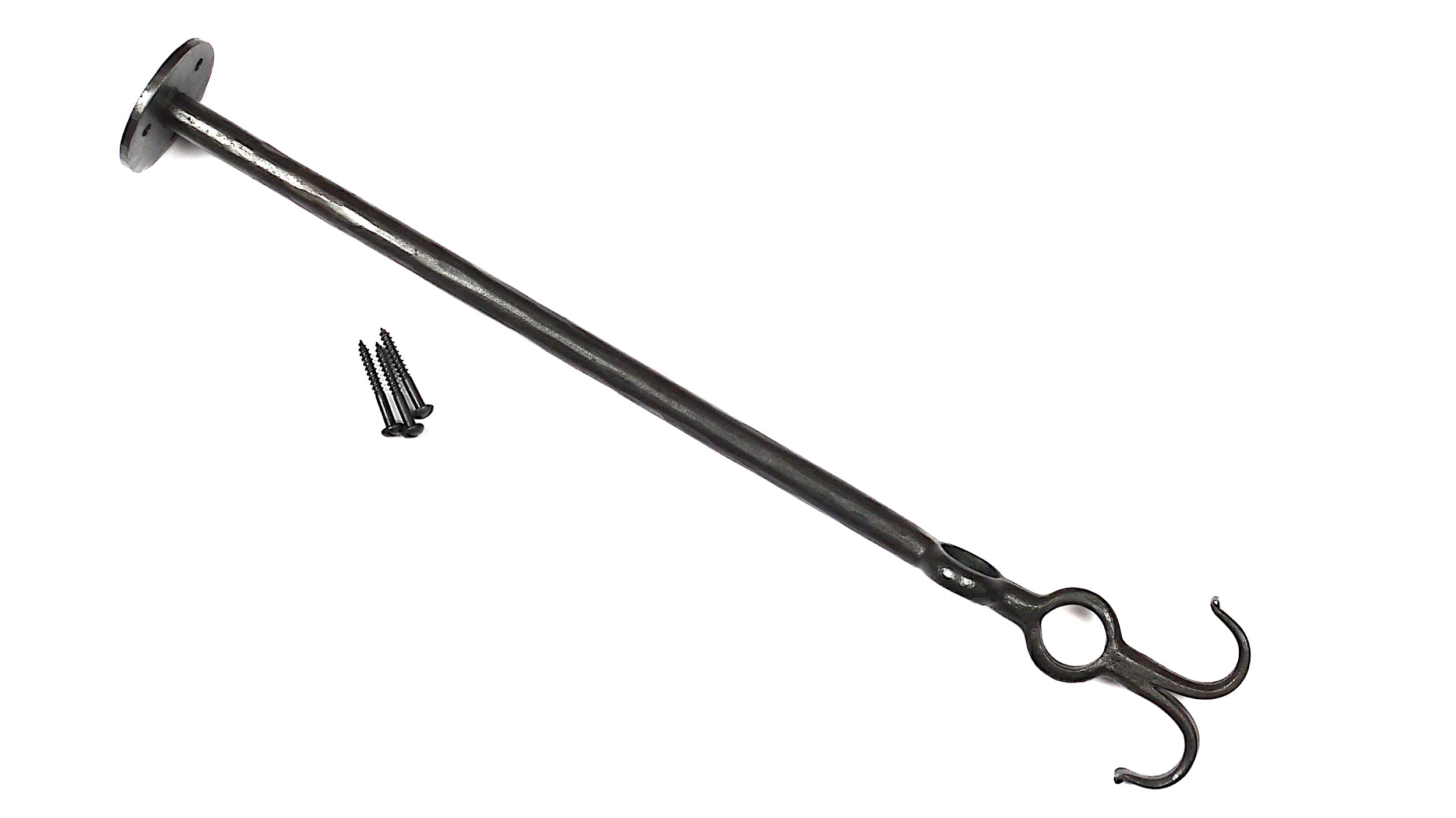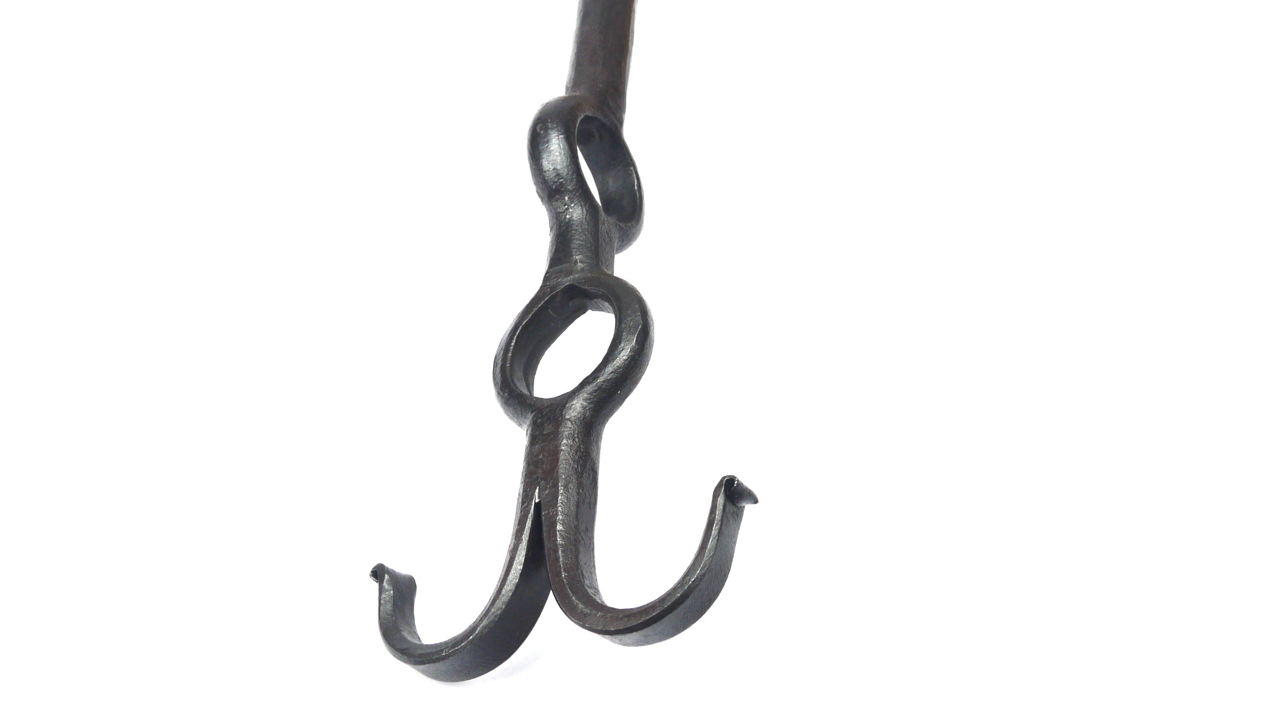 Geschmiedet aus 16 mm Rundmaterial mit 2 Lochungen über Kreuz, die einen Durchmesser von ca. 27 mm haben.