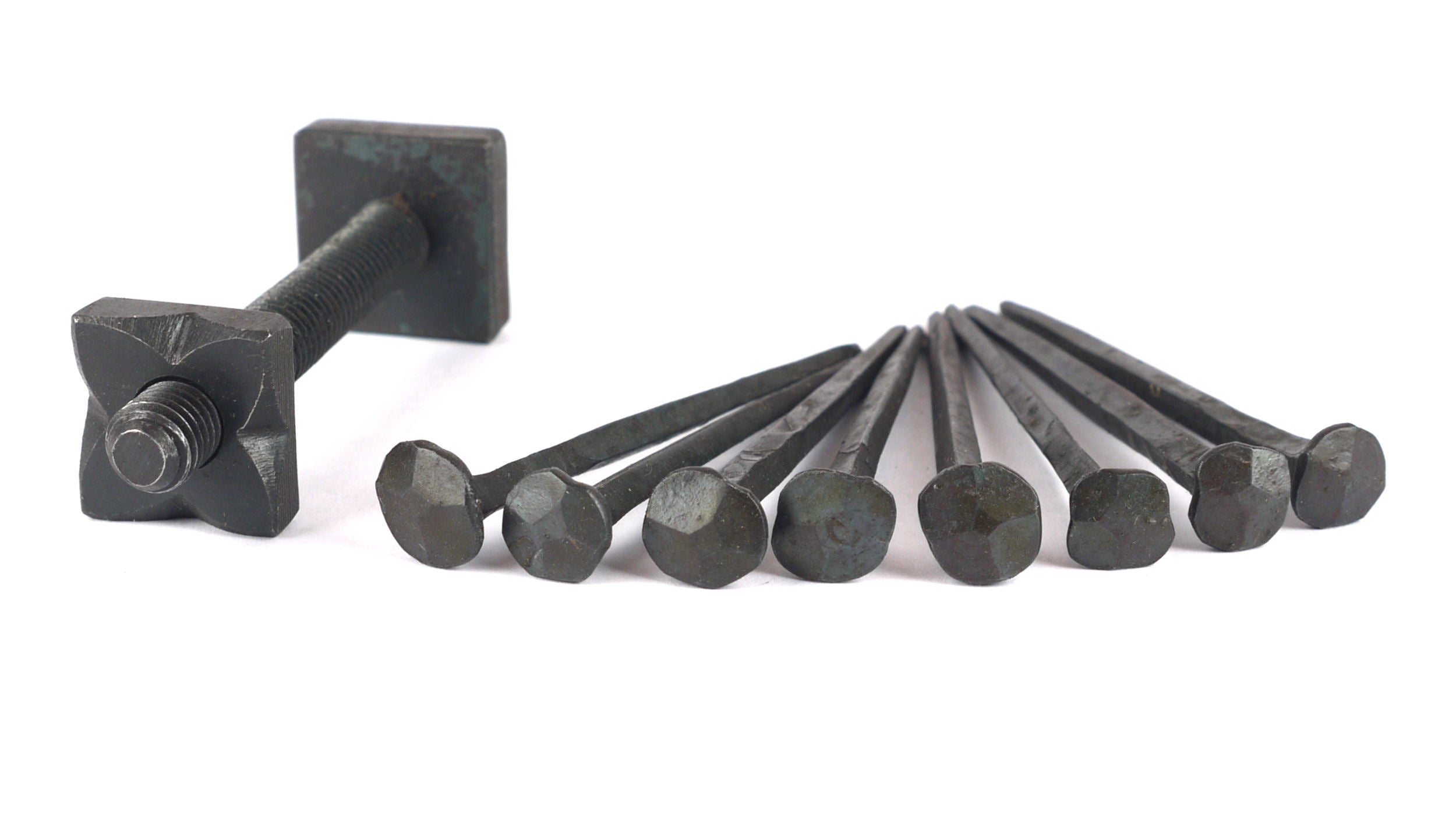 Der Befestigungssatz besteht aus 8 handgeschmiedeten Nägeln und einer Schloßschraube M 8 mit Blumenmuster.