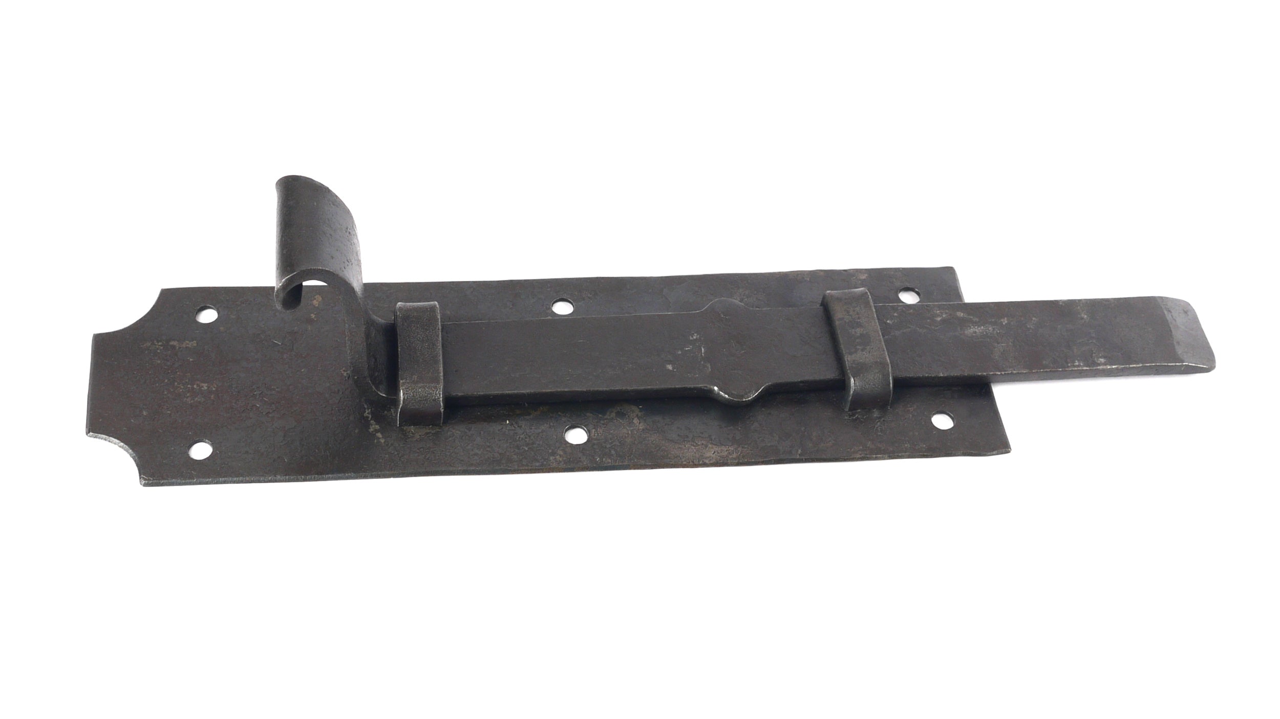 Geschmiedeter Schieberiegel, in Handarbeit nach historischem Vorbild geschmiedet. Der Riegel ist auf einer Blechplatte montiert.